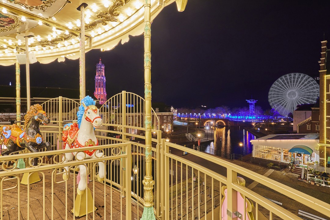 這是一座以神話為主題,讓人盡情享受華麗世界觀的日本首座三層旋轉木馬。它的高度是世界最大規模的15公尺,義大利製的馬車與貢多拉宛如藝術品。白天與夜晚展現截然不同的風情,也是其魅力之一。從三樓還能一覽豪斯登堡整個街景。
