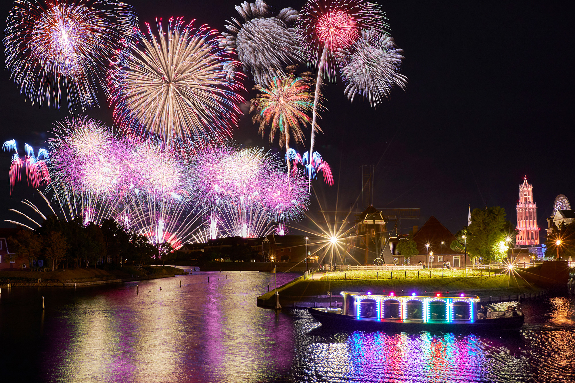 カウントダウン花火としては日本最大規模となる8,000発の花火が夜空を埋め尽くし、ハウステンボス全体が祝祭感に包まれます