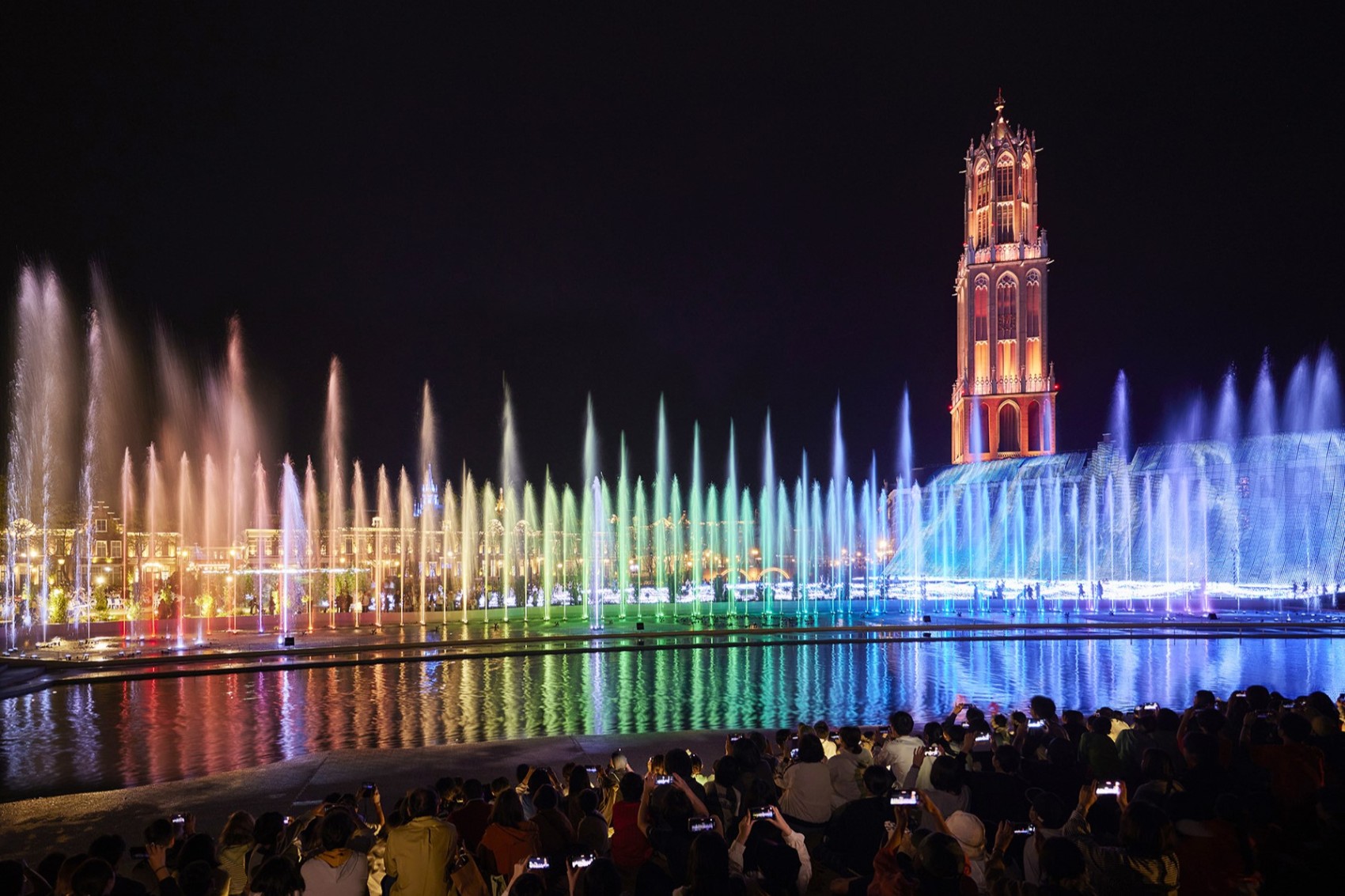 欣賞與聲光結合的壯觀噴泉表演。