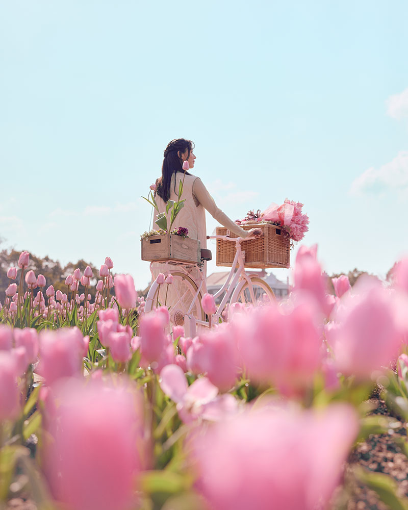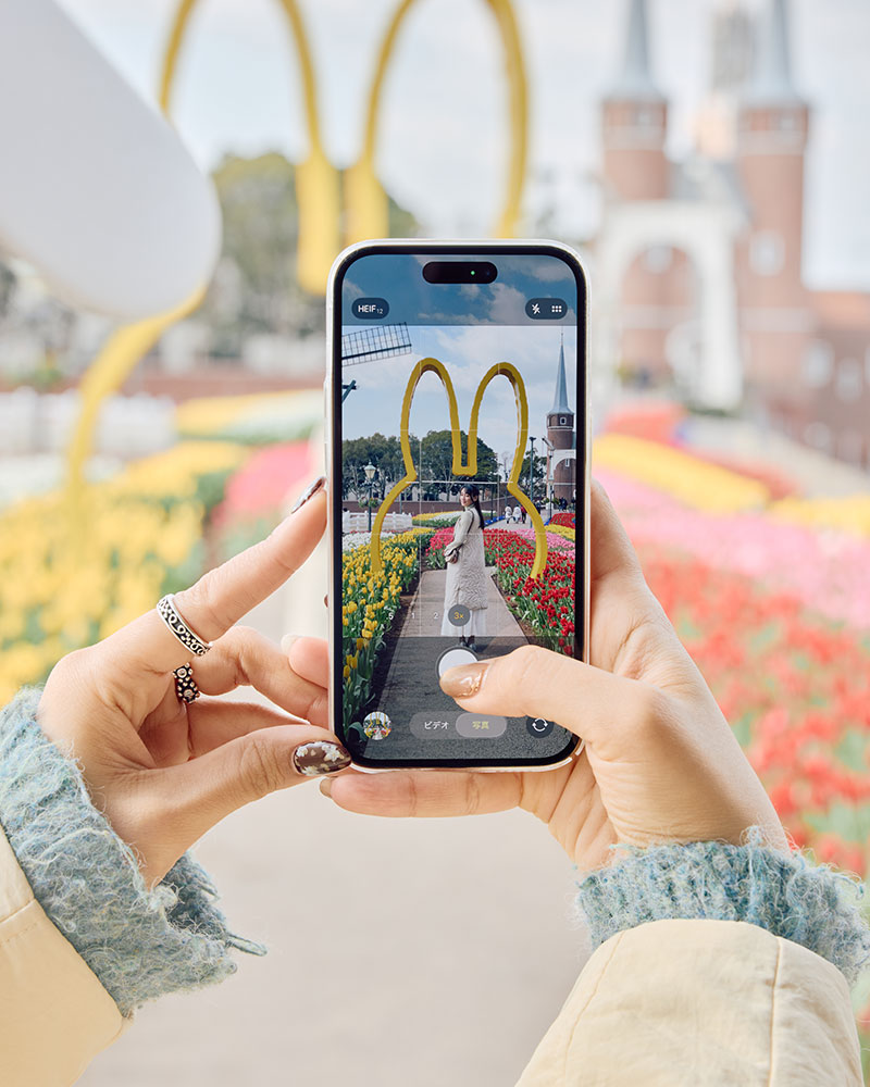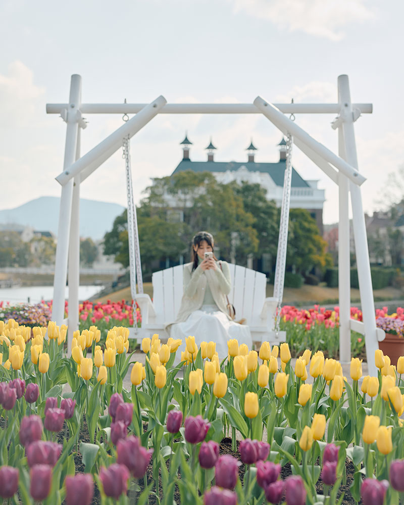 チューリップに囲まれたなかで可愛らしい写真を撮れるフォトスポットが登場。青空と異国情緒の街並みを背景に旅の思い出を撮影しませんか。