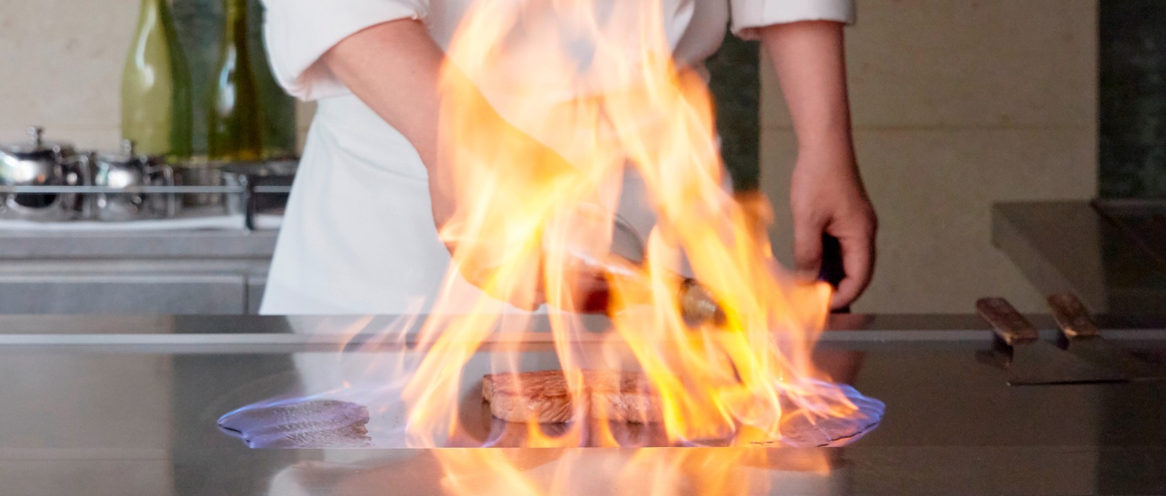 您可以在鐵板燒上享用長崎和牛等從九州各地嚴選的食材。我們的品牌牛肉的味道會根據燒烤程度而發生巨大變化,由我們技術精湛的廚師在賓客面前精心、動態地烹製。您可以享受片刻的幸福和最好的品味。