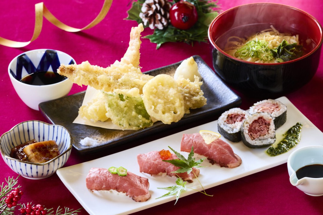 能盡享烤牛肉的手握壽司、卷壽司、五島烏冬面,還有整條炸星鰻,是奢侈的膳食。 價格:2,800日元
