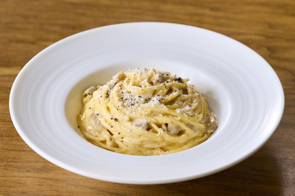 濃厚なクリームソースにパンチェッタの塩気とブラックペッパーが食欲をそそるパスタの定番。 【アレルギー:小麦・卵・乳成分】