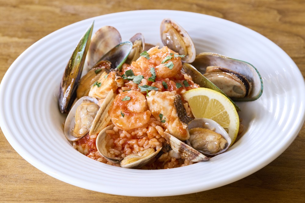 たっぷりの魚介を使用し、だしの旨味がきいたトマトソースのリゾット。 【アレルギー:乳成分・エビ】