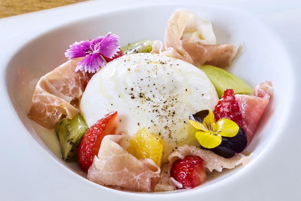 濃厚ブッラータチーズを使用したカプレーゼ。 ※フルーツは変更になる場合があります 【アレルギー:乳成分】