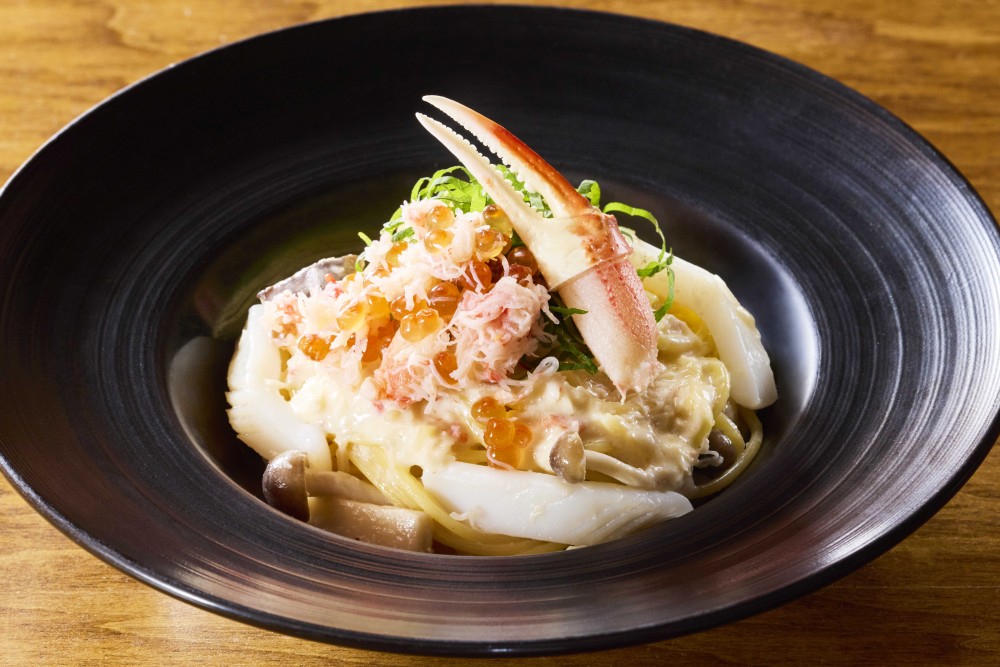 カニ、イクラ、イカと海鮮たっぷりの食べ応えのある和風クリームスパゲティ。 【アレルギー:小麦・乳成分・カニ】