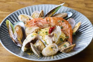 大量使用大份海鮮制作的美味十足的豪華辣椒意面【過敏:小麥・蝦】
