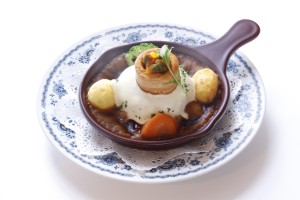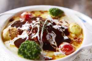 多汁的漢堡牛排,上面放有長崎的大醬和特殊的奶酪醬,以及上面有料理鼠王的餡餅。