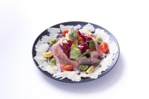 Cheese Waag特色沙拉和立陶宛奶酪“ Dugas”撒在意大利熏火腿周圍。