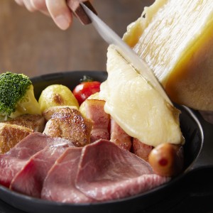 正宗瑞士拉可雷特芝士,澆滿雞肉、烤牛肉、大阿蘇培根、蔬菜的濃厚熱騰騰的絕品。※以加芝士的狀態提供。※圖片是圖片