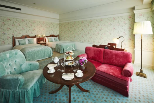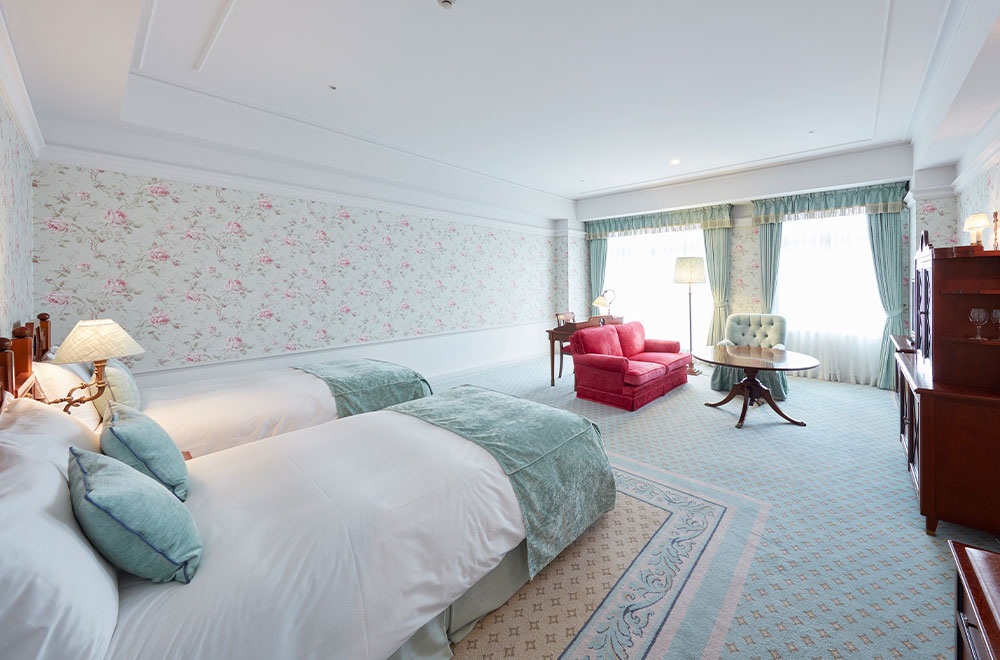 這個房間很寬敞,從大窗戶可以看到迷人的景色。