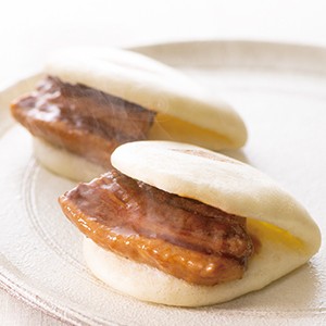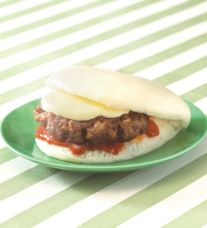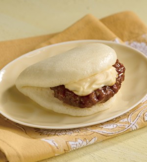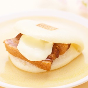 照燒漢堡包夾在Kakuboiled Manju蓬鬆的麵團之間。
