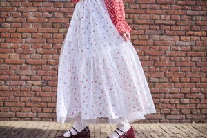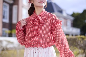 層疊的雪紡營造出適中的蓬鬆感,打造出優雅甜美的造型,又不顯得過於甜膩。草莓和miffy圖案點綴著波點設計,更顯精緻。建議搭配襯衫穿著。